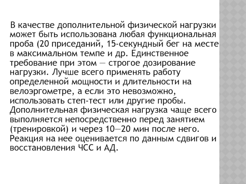 функциональная проба (20 приседаний, 15-секундный бег на месте в максимальном темпе и др. Единственное требование при этом — строгое дозирование нагрузки. Лучше всего применять работу определенной мощности и длительности на велоэргометре, а если это невозможно, использовать степ-тест или другие пробы. Дополнительная физическая нагрузка чаще всего выполняется непосредственно перед занятием (тренировкой) и через 10—20 мин после него. Реакция на нее оценивается по данным сдвигов и восстановления ЧСС и АД.