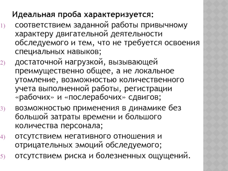 достаточной нагрузкой, вызывающей преимущественно общее, а не локальное утомление, возможностью количественного учета выполненной работы, регистрации «рабочих» и «послерабочих» сдвигов;