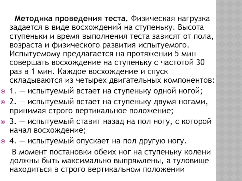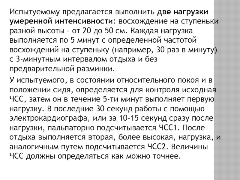 Слайд 50 Испытуемому предлагается выполнить две нагрузки умеренной интенсивности: восхождение на