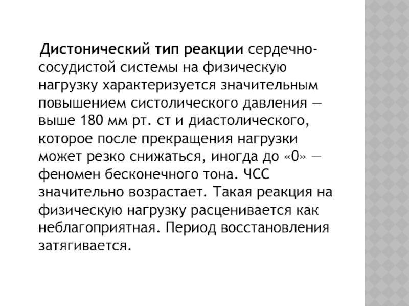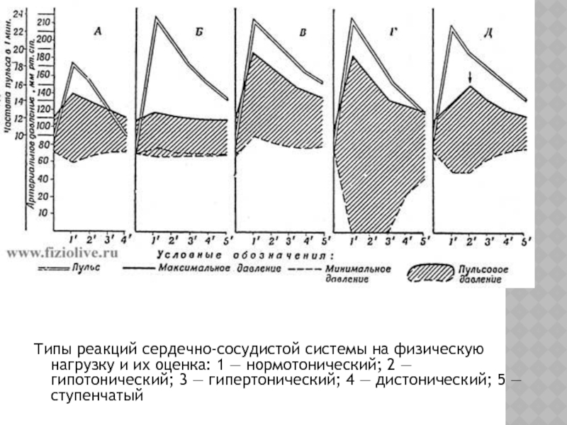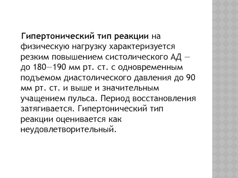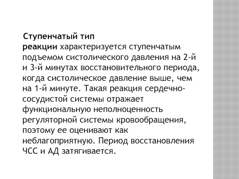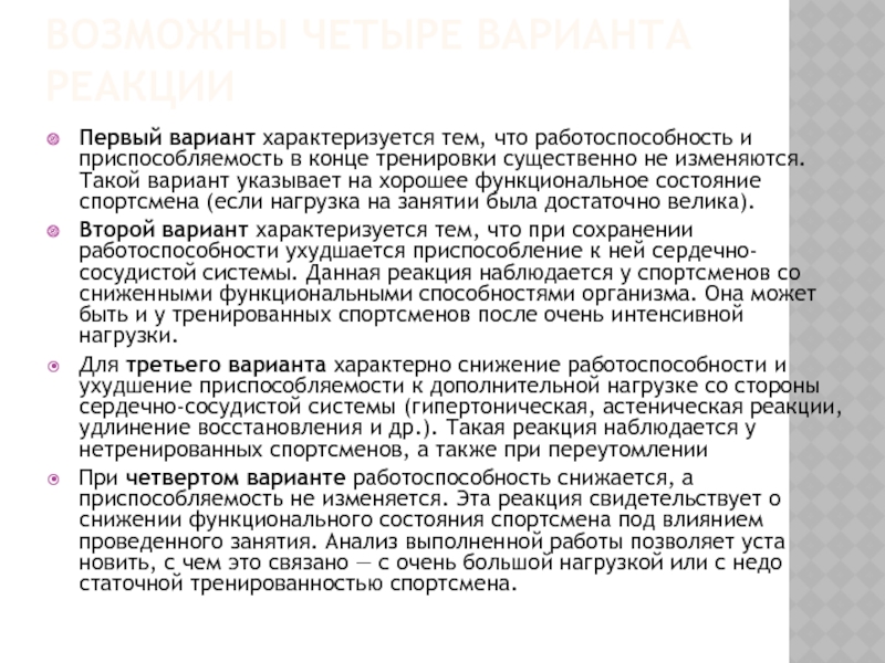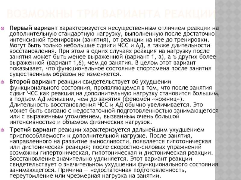 Для третьего варианта характерно снижение работоспособности и ухудшение приспособляемости к дополнительной нагрузке со стороны сердечно-сосудистой системы (гипертоническая, астеническая реакции, удлинение восстановления и др.). Такая реакция наблюдается у нетренированных спортсменов, а также при переутомлении