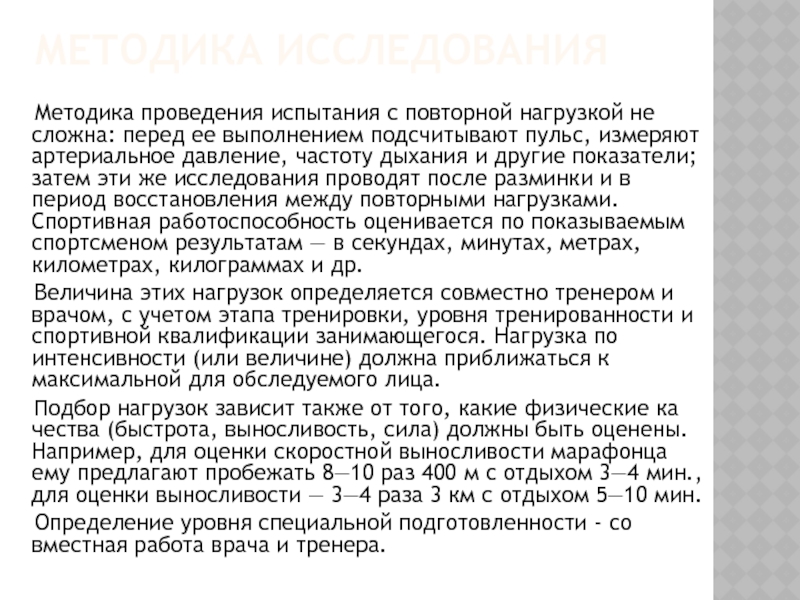 Величина этих нагрузок определяется совместно тренером и врачом, с учетом этапа тренировки, уровня тренированности и спортивной квалификации занимающегося. Нагрузка по интенсивности (или величине) должна приближаться к максимальной для обследуемого лица.