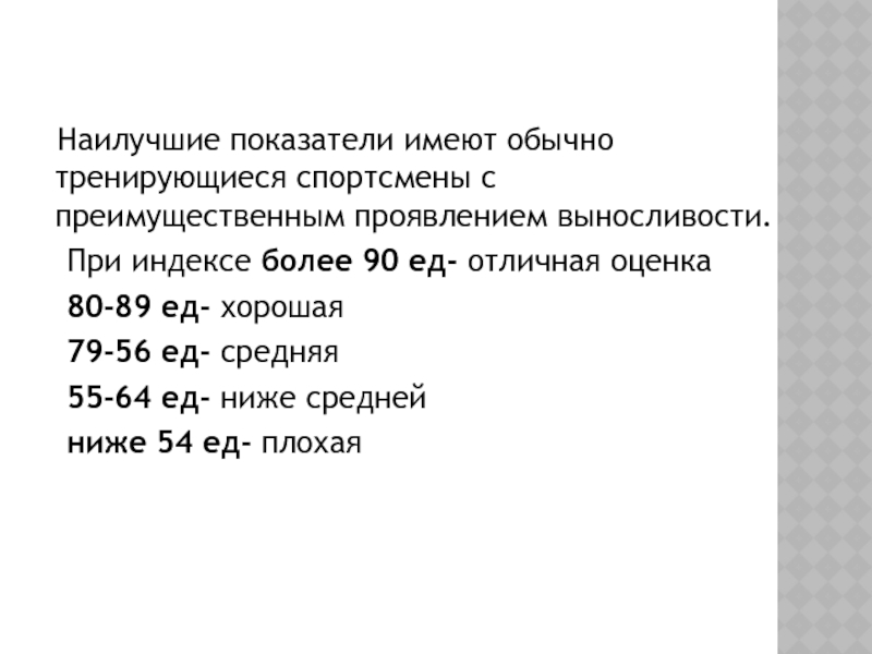 Слайд 45 Наилучшие показатели имеют обычно тренирующиеся спортсмены с преимущественным проявлением