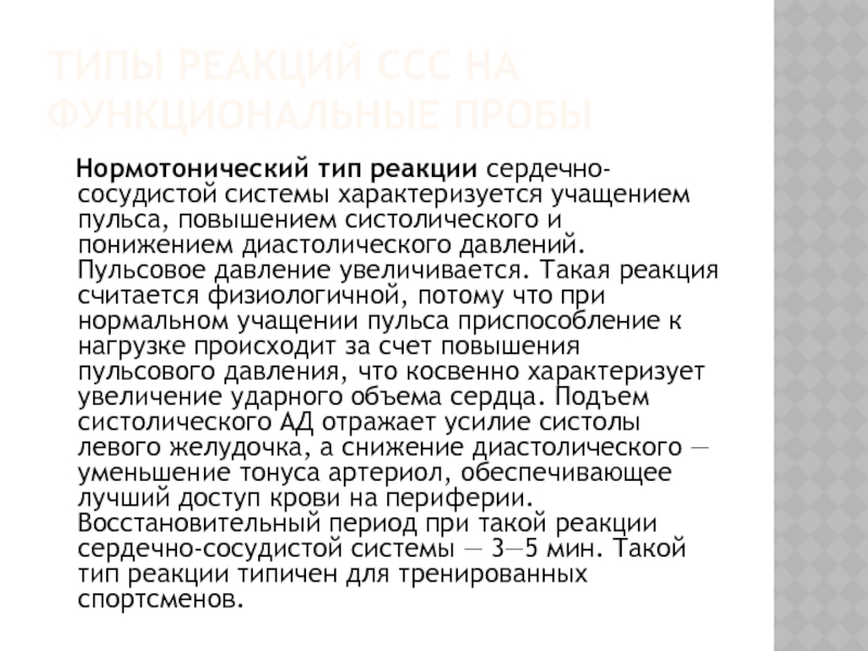 Оптимальной реакцией является небольшое учащение ЧСС и незначительные сдвиги АД. При увеличении тренированности эти сдвиги становятся меньше.