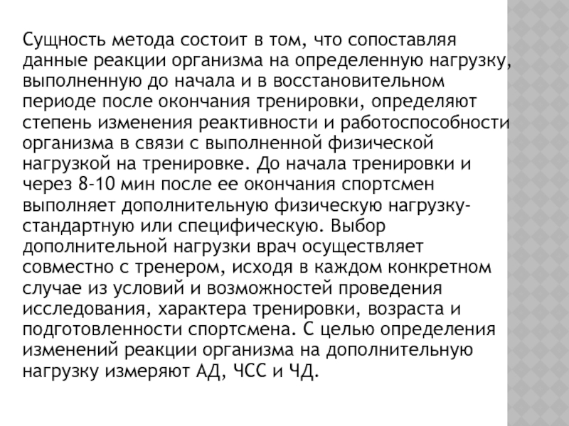 Данные, получаемые с помощью метода дополнительных нагрузок характеризуют степень воздействия тренировочных или соревновательных нагрузок на организм и динамику его восстановления