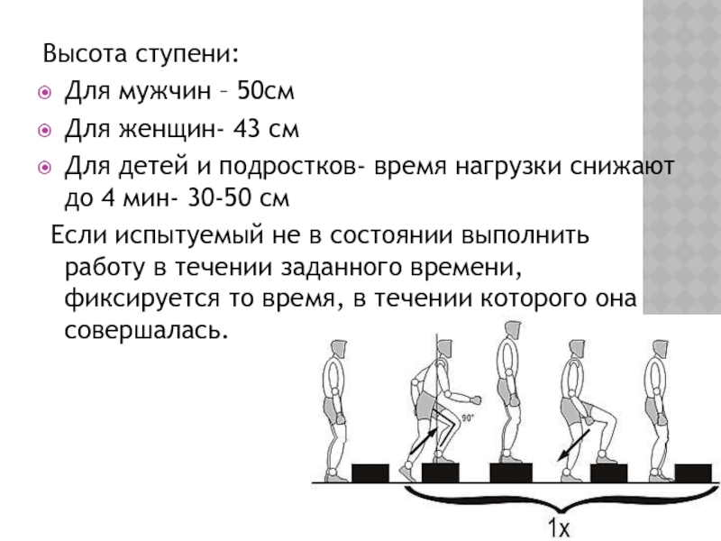 ступеньки разной высоты - от 20 до 50 см. Каждая нагрузка выполняется по 5 минут с определенной частотой восхождений на ступеньку (например, 30 раз в минуту) с 3-минутным интервалом отдыха и без предварительной разминки.