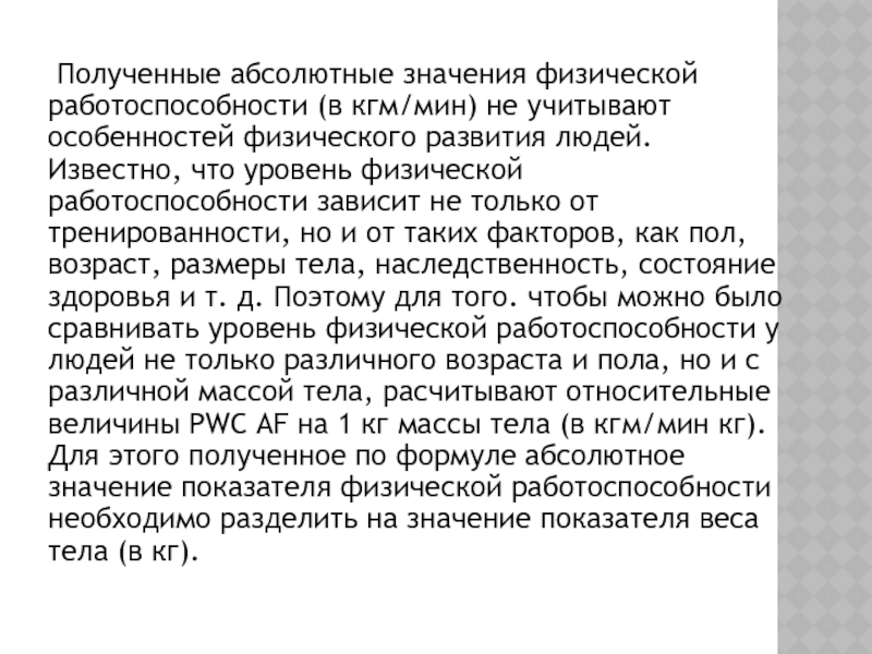 Слайд 52 Полученные абсолютные значения физической работоспособности (в кгм/мин) не учитывают