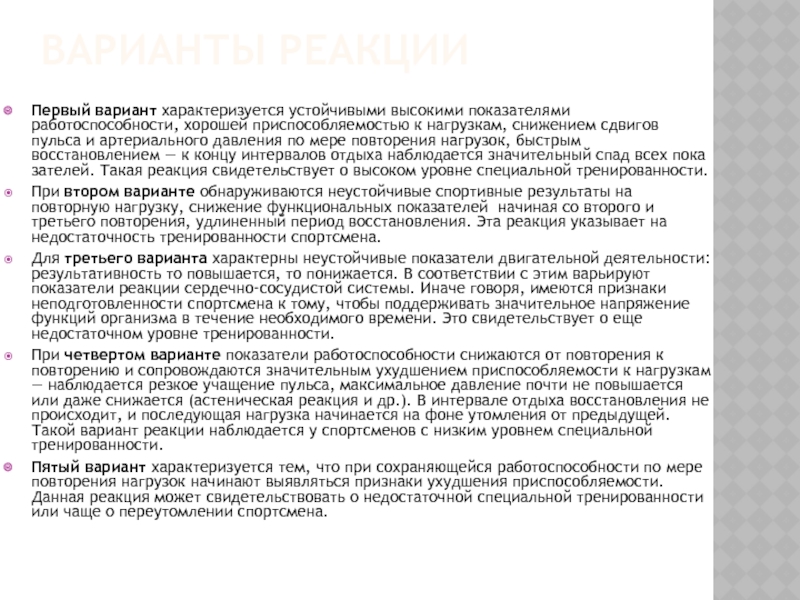 При четвертом варианте показатели работоспособности снижаются от повторения к повторению и сопровождаются значительным ухудшением приспособляемости к нагрузкам — наблюдается резкое учащение пульса, максимальное давление почти не повышается или даже снижается (астеническая реакция и др.). В интервале отдыха восстановления не происходит, и последующая нагрузка начинается на фоне утомления от предыдущей. Такой вариант реакции наблюдается у спортсменов с низким уровнем специальной тренированности.