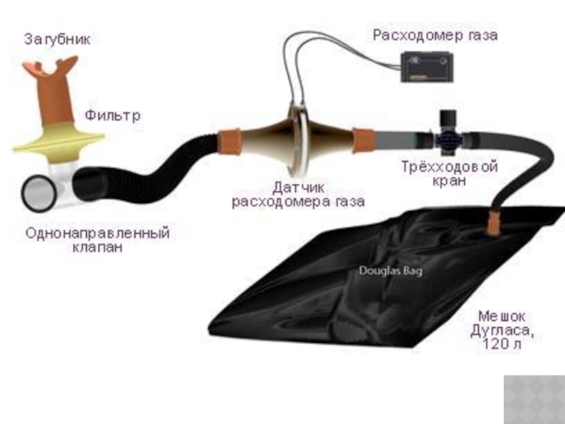 мешка Дугласа через вентиль и мундштук с зажатым специальным зажимом носом. Выдыхает обследуемый в атмосферу. Мешок Дугласа заполняется заготовленной предварительно газовой смесью (воздух с кислородом или азотом в определенной пропорции). Наиболее эффективной является смесь, содержащая 10% кислорода. Длительность пробы определяется задачей исследования.