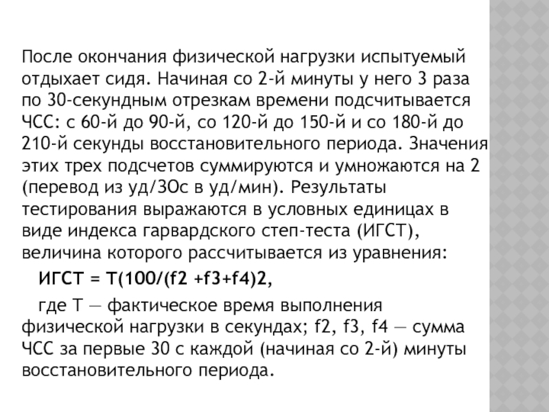 2-й минуты у него 3 раза по 30-секундным отрезкам времени подсчитывается ЧСС: с 60-й до 90-й, со 120-й до 150-й и со 180-й до 210-й секунды восстановительного периода. Значения этих трех подсчетов суммируются и умножаются на 2 (перевод из уд/ЗОс в уд/мин). Результаты тестирования выражаются в условных единицах в виде индекса гарвардского степ-теста (ИГСТ), величина которого рассчитывается из уравнения: