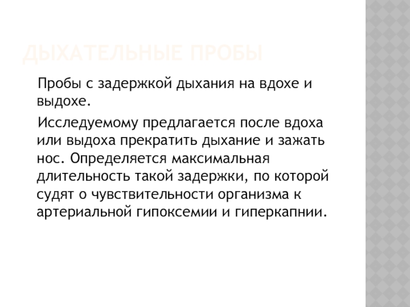 Исследуемому предлагается после вдоха или выдоха прекратить дыхание и зажать нос. Определяется максимальная длительность такой задержки, по которой судят о чувствительности организма к артериальной гипоксемии и гиперкапнии.