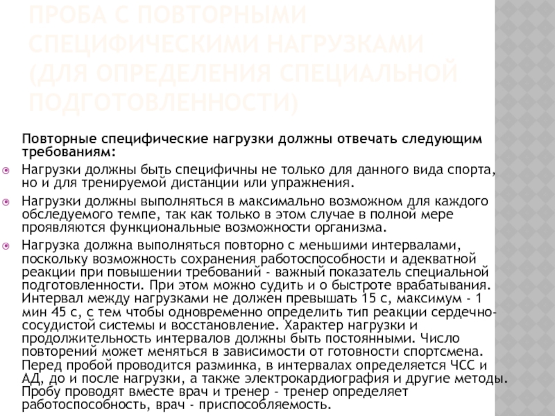 Слайд 61Проба с повторными специфическими нагрузками (для определения специальной подготовленности)