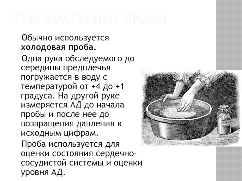 до середины предплечья погружается в воду с температурой от +4 до +1 градуса. На другой руке измеряется АД до начала пробы и после нее до возвращения давления к исходным цифрам.