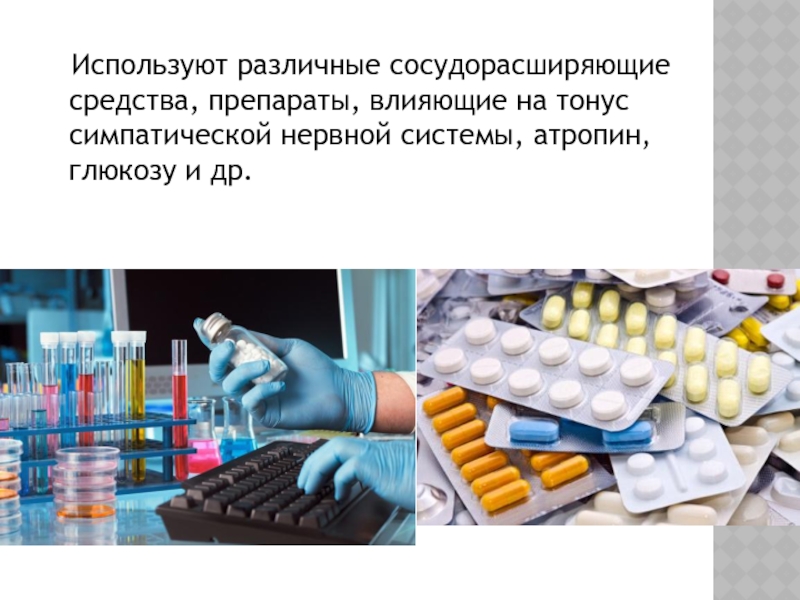 Слайд 20 Используют различные сосудорасширяющие средства, препараты, влияющие на тонус симпатической