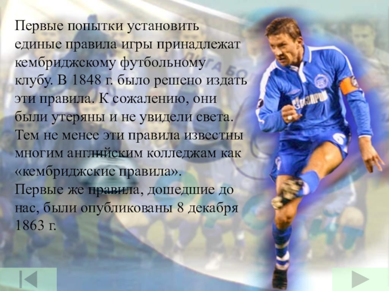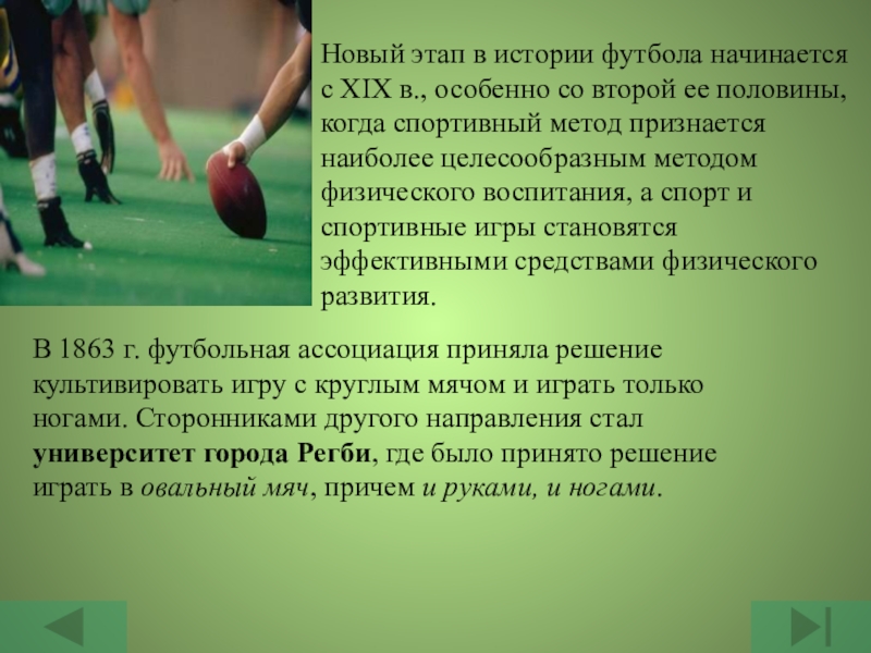 В 1863 г. футбольная ассоциация приняла решение культивировать игру с круглым мячом и играть только ногами. Сторонниками другого направления стал университет города Регби, где было принято решение играть в овальный мяч, причем и руками, и ногами.