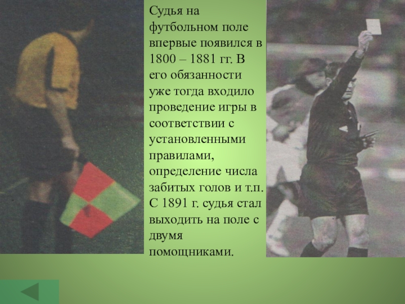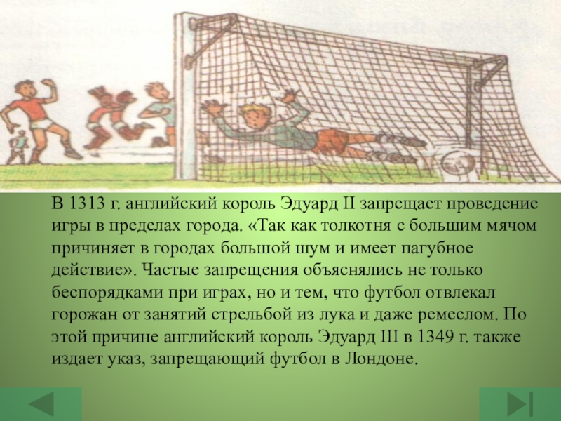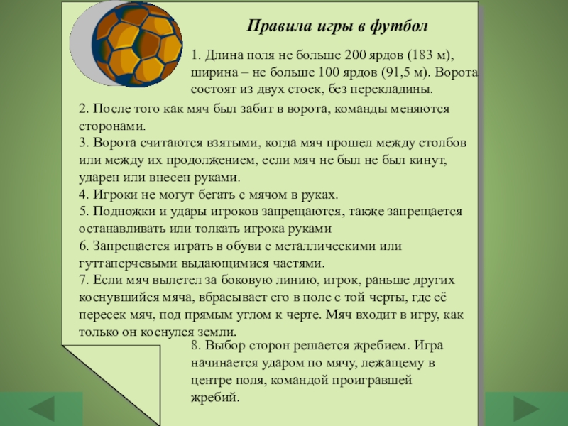 2. После того как мяч был забит в ворота, команды меняются сторонами. 3. Ворота считаются взятыми, когда мяч прошел между столбов или между их продолжением, если мяч не был не был кинут, ударен или внесен руками. 4. Игроки не могут бегать с мячом в руках. 5. Подножки и удары игроков запрещаются, также запрещается останавливать или толкать игрока руками 6. Запрещается играть в обуви с металлическими или гуттаперчевыми выдающимися частями. 7. Если мяч вылетел за боковую линию, игрок, раньше других коснувшийся мяча, вбрасывает его в поле с той черты, где её пересек мяч, под прямым углом к черте. Мяч входит в игру, как только он коснулся земли.