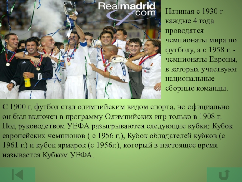 С 1900 г. футбол стал олимпийским видом спорта, но официально он был включен в программу Олимпийских игр только в 1908 г. Под руководством УЕФА разыгрываются следующие кубки: Кубок европейских чемпионов ( с 1956 г.), Кубок обладателей кубков (с 1961 г.) и кубок ярмарок (с 1956г.), который в настоящее время называется Кубком УЕФА.