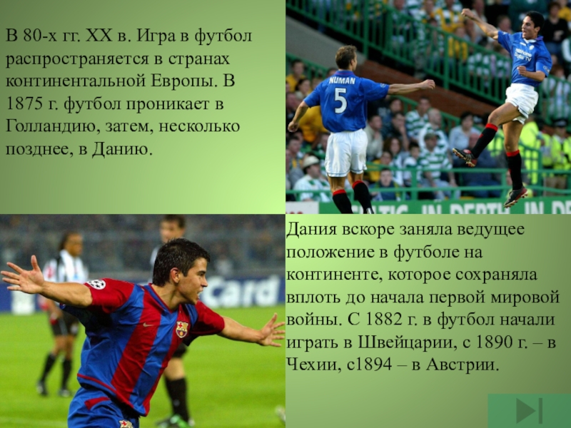 Дания вскоре заняла ведущее положение в футболе на континенте, которое сохраняла вплоть до начала первой мировой войны. С 1882 г. в футбол начали играть в Швейцарии, с 1890 г. – в Чехии, с1894 – в Австрии.