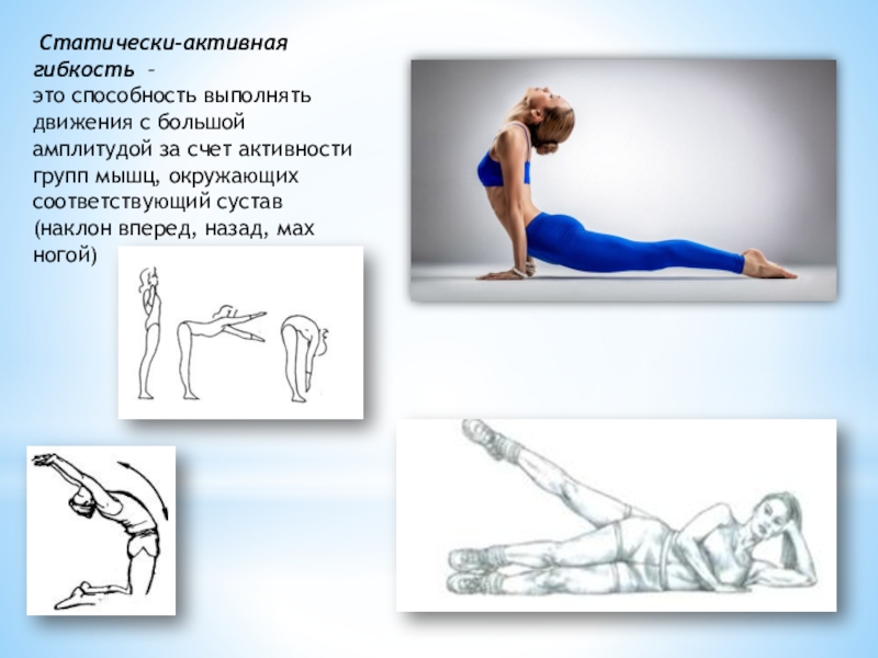 ● статически-активная гибкость — способность принятия и поддержания растянутого положения только мышечным усилием.