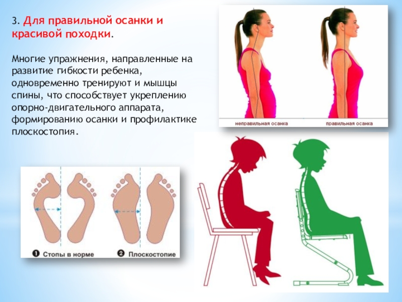 развитие гибкости ребенка, одновременно тренируют и мышцы спины, что способствует укреплению опорно-двигательного аппарата, формированию осанки и профилактике плоскостопия.