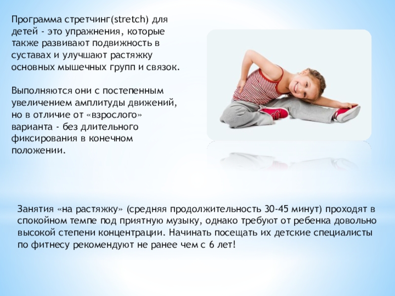 Слайд 21Программа стретчинг(stretch) для детей - это упражнения, которые также развивают подвижность