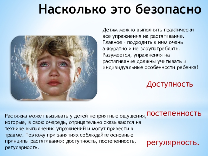 Растяжка может вызывать у детей неприятные ощущения, которые, в свою очередь, отрицательно сказываются на технике выполнения упражнений и могут привести к травме. Поэтому при занятиях соблюдайте основные принципы растягивания: доступность, постепенность, регулярность.