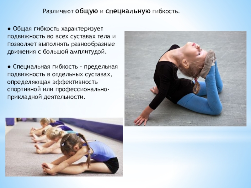 ● Специальная гибкость – предельная подвижность в отдельных суставах, определяющая эффективность спортивной или профессионально-прикладной деятельности.