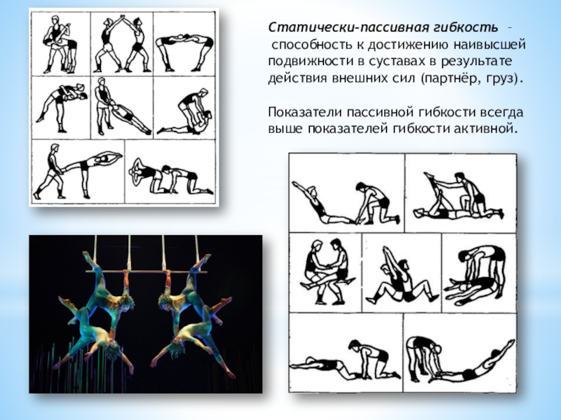 ● статически-пассивная гибкость — способность принятия растянутого положения и его поддержания своим собственным весом, удержанием руками или с помощью снарядов или партнёра.