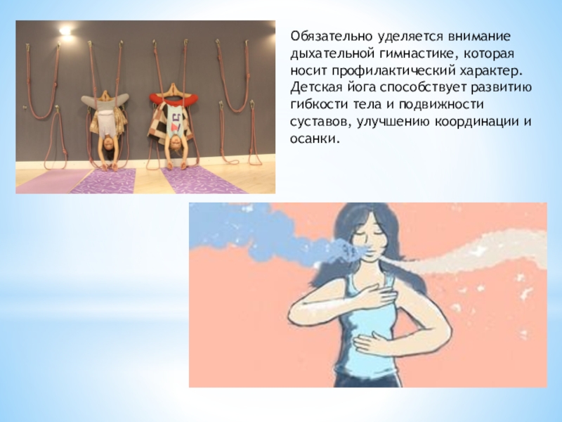 Слайд 20Обязательно уделяется внимание дыхательной гимнастике, которая носит профилактический характер. Детская йога