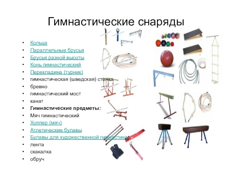 Гимнастические снарядыКольцаПараллельные брусьяБрусья разной высотыКонь гимнастическийПерекладина (турник)гимнастическая (шведская) стенкабревногимнастический мостканатГимнастические предметы:Мяч гимнастическийХоппер (мяч)Атлетические булавыБулавы для художественной гимнастикилентаскакалкаобруч