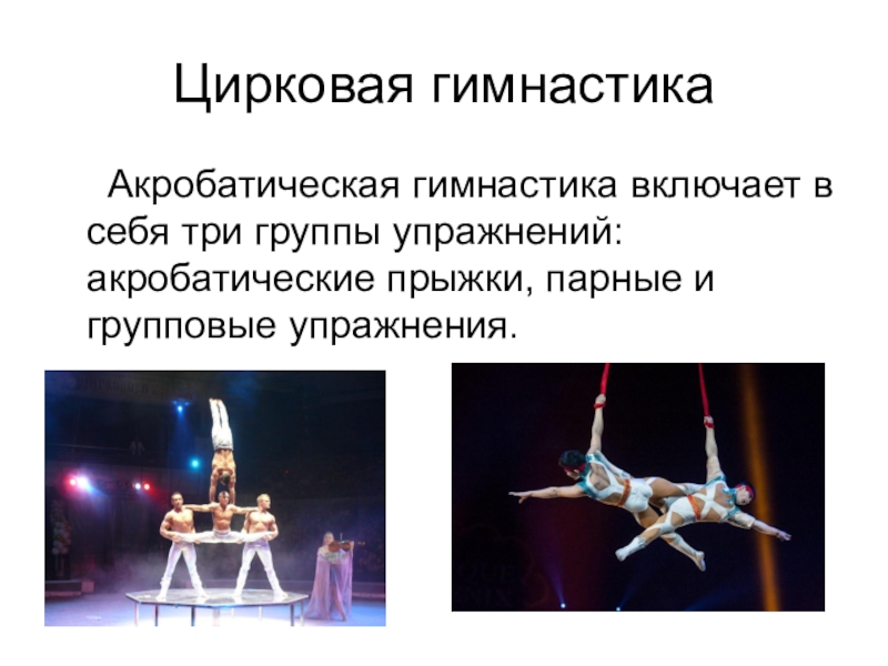 Цирковая гимнастика   Акробатическая гимнастика включает в себя три группы упражнений: акробатические прыжки, парные и групповые