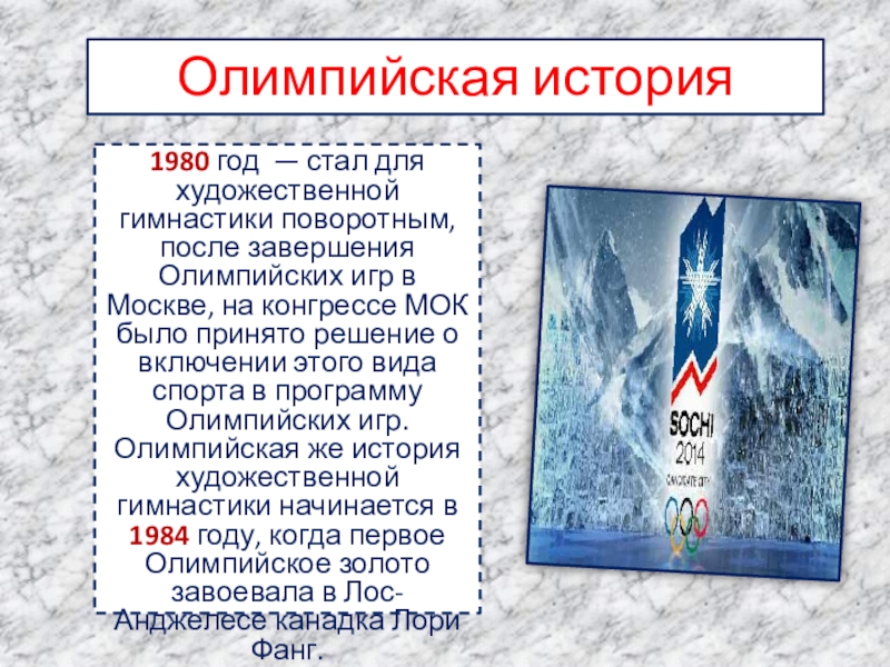 Олимпийская же история художественной гимнастики начинается в 1984 году, когда первое Олимпийское золото завоевала в Лос-Анджелесе канадка Лори Фанг.