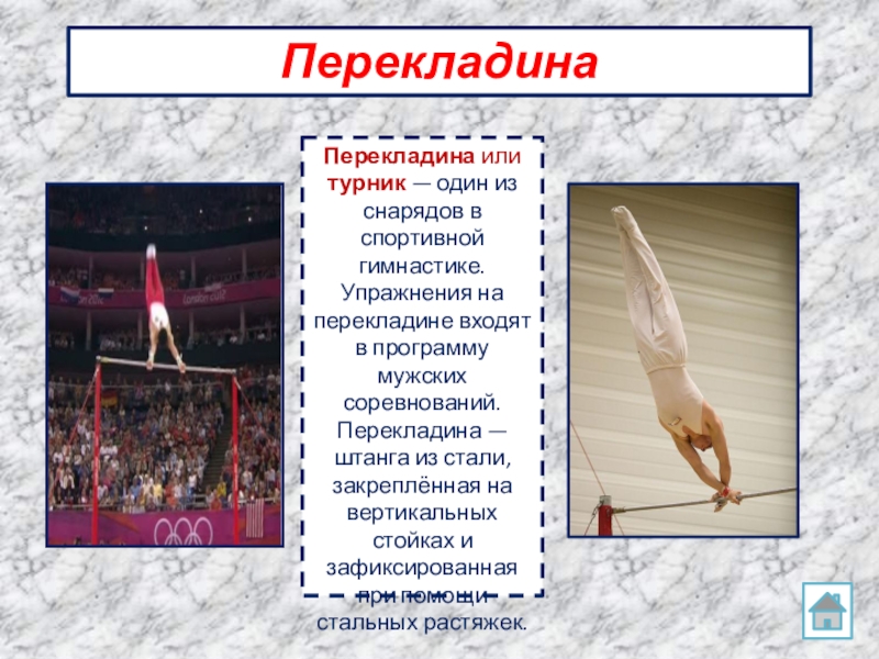 перекладине входят в программу мужских соревнований. Перекладина — штанга из стали, закреплённая на вертикальных стойках и зафиксированная при помощи стальных растяжек.