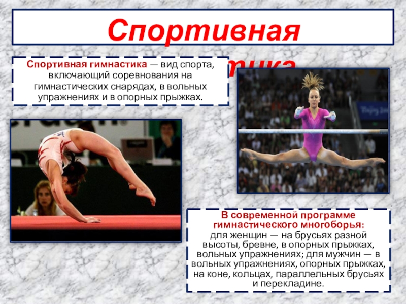 Спортивная гимнастика — вид спорта, включающий соревнования на гимнастических снарядах, в
