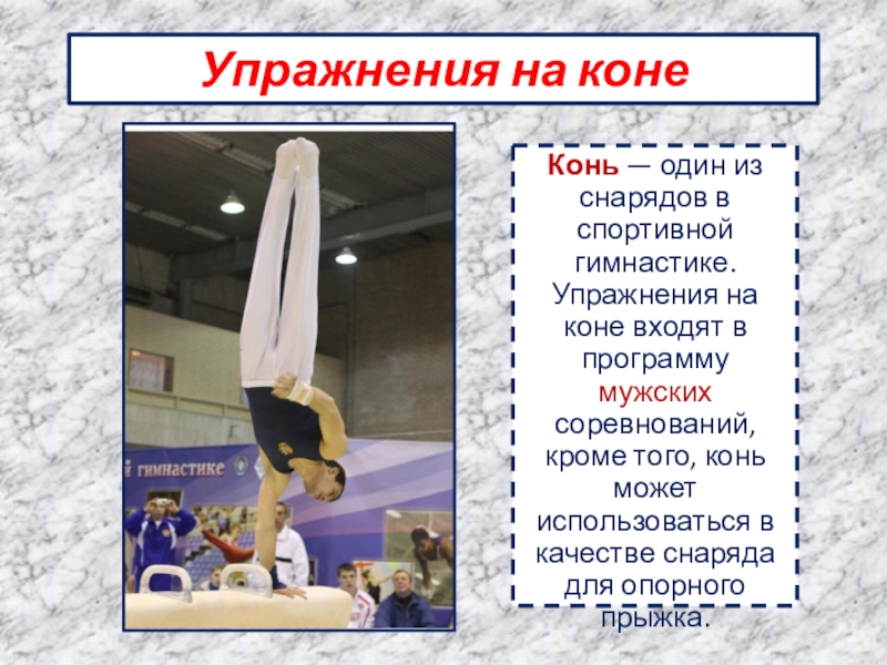 Конь — один из снарядов в спортивной гимнастике. Упражнения на