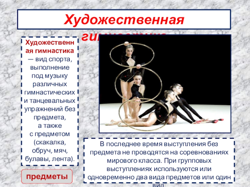 Художественная гимнастика — вид спорта, выполнение под музыку различных гимнастических