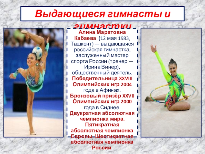 Алина Маратовна Кабаева (12 мая 1983, Ташкент) — выдающаяся
