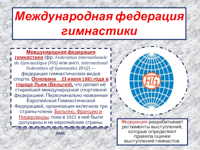 Международная федерация гимнастики (фр. Federation Internationale de Gymnastique (FIG) или