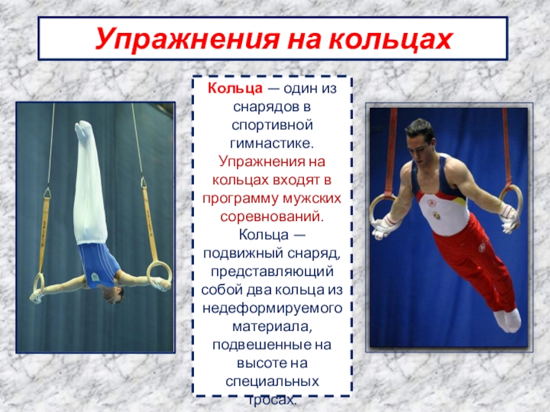 Кольца — один из снарядов в спортивной гимнастике. Упражнения на