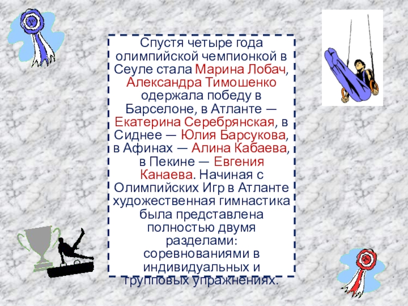 Слайд 28Спустя четыре года олимпийской чемпионкой в Сеуле стала Марина Лобач, Александра