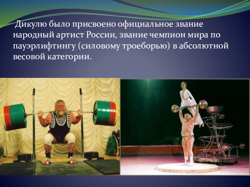 Слайд 5 Дикулю было присвоено официальное звание народный артист России, звание чемпион
