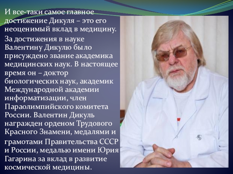 За достижения в науке Валентину Дикулю было присуждено звание академика медицинских наук. В настоящее время он – доктор биологических наук, академик Международной академии информатизации, член Параолимпийского комитета России. Валентин Дикуль награжден орденом Трудового Красного Знамени, медалями и