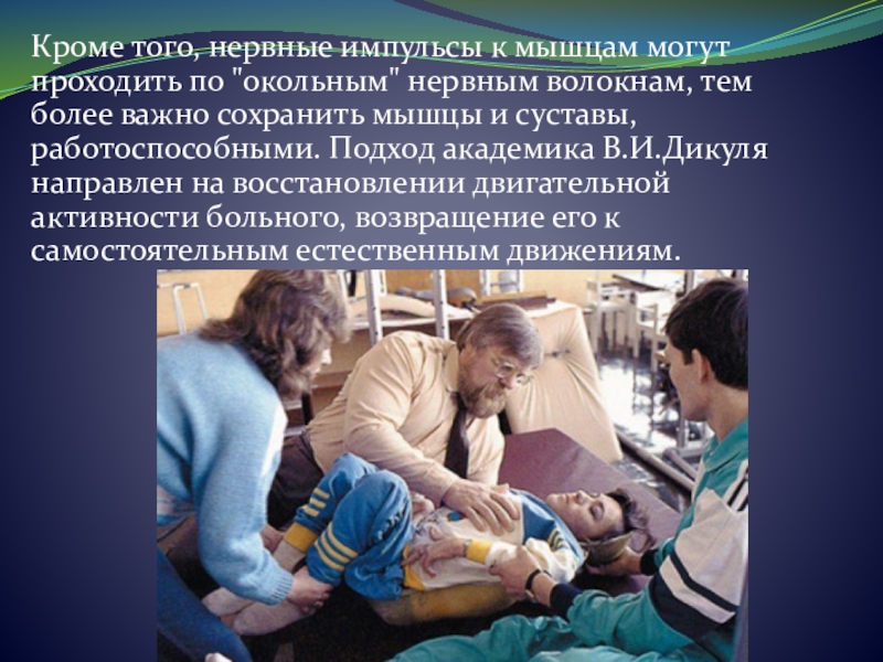 волокнам, тем более важно сохранить мышцы и суставы, работоспособными. Подход академика В.И.Дикуля направлен на восстановлении двигательной активности больного, возвращение его к самостоятельным естественным движениям.
