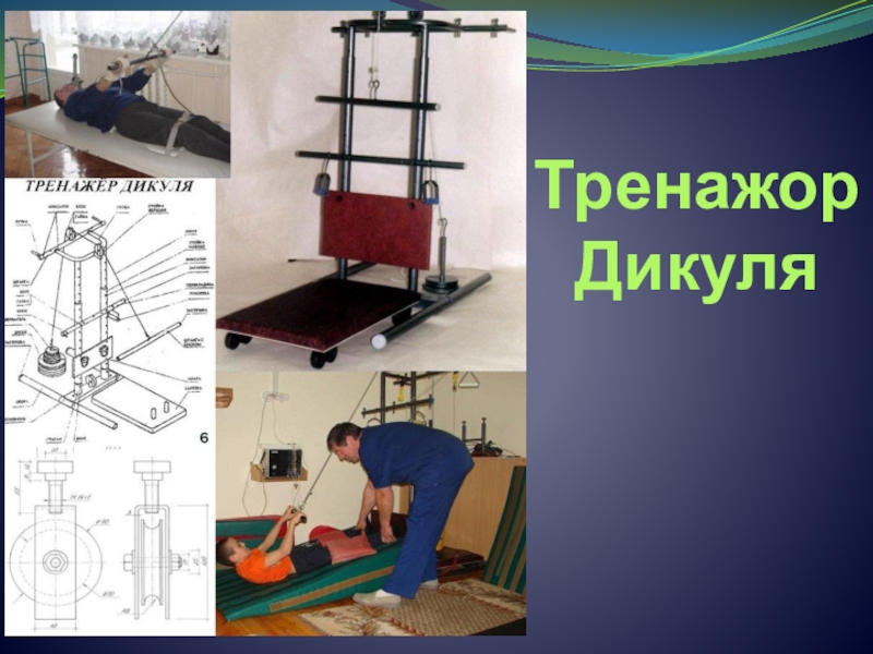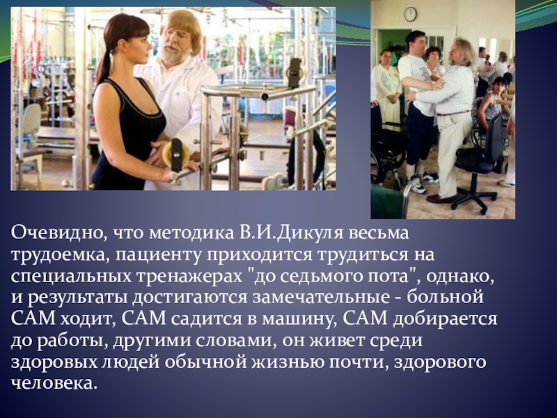 Слайд 13Очевидно, что методика В.И.Дикуля весьма трудоемка, пациенту приходится трудиться на специальных