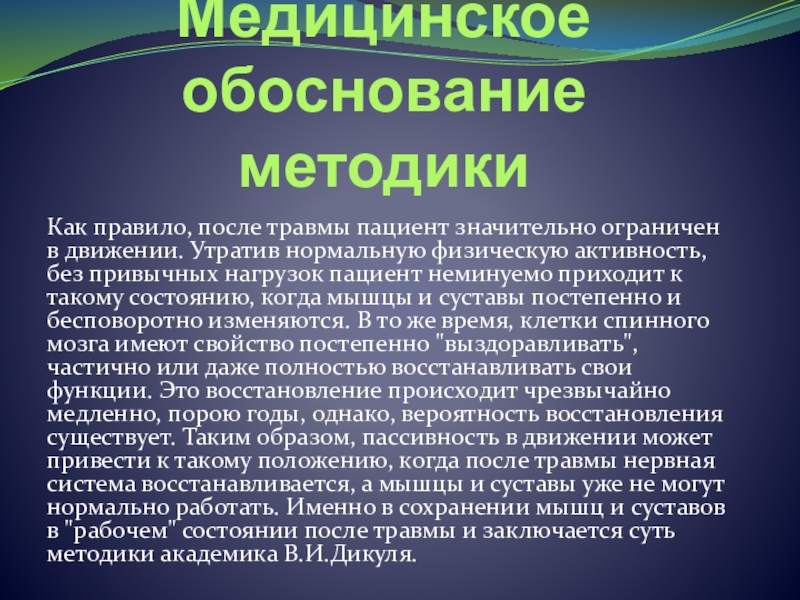 Утратив нормальную физическую активность, без привычных нагрузок пациент неминуемо приходит к такому состоянию, когда мышцы и суставы постепенно и бесповоротно изменяются. В то же время, клетки спинного мозга имеют свойство постепенно "выздоравливать", частично или даже полностью восстанавливать свои функции. Это восстановление происходит чрезвычайно медленно, порою годы, однако, вероятность восстановления существует. Таким образом, пассивность в движении может привести к такому положению, когда после травмы нервная система восстанавливается, а мышцы и суставы уже не могут нормально работать. Именно в сохранении мышц и суставов в "рабочем" состоянии после травмы и заключается суть методики академика В.И.Дикуля.