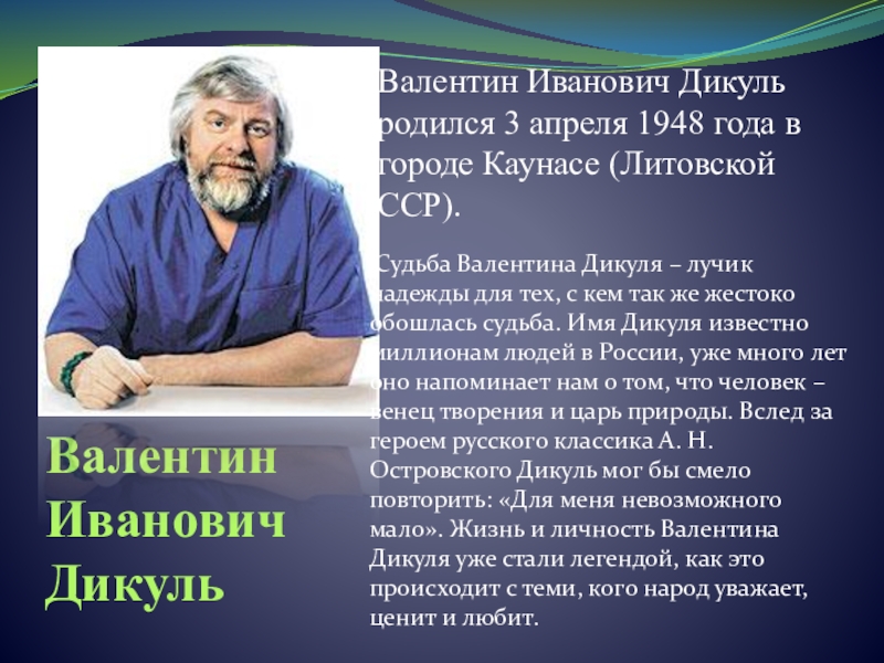 Судьба Валентина Дикуля – лучик надежды для тех, с кем так же жестоко обошлась судьба. Имя Дикуля известно миллионам людей в России, уже много лет оно напоминает нам о том, что человек – венец творения и царь природы. Вслед за героем русского классика А. Н. Островского Дикуль мог бы смело повторить: «Для меня невозможного