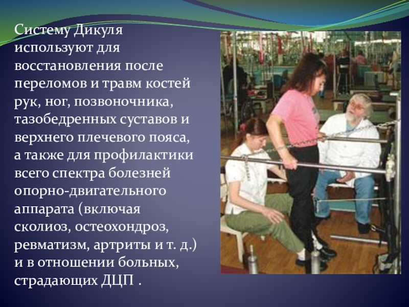 Слайд 14Систему Дикуля используют для восстановления после переломов и травм костей рук,