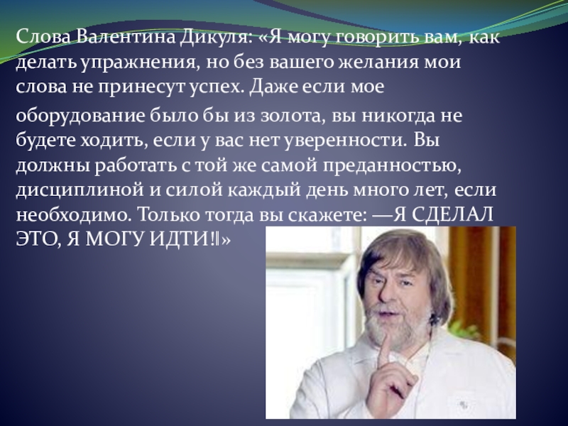 Слайд 8Слова Валентина Дикуля: «Я могу говорить вам, как делать упражнения, но