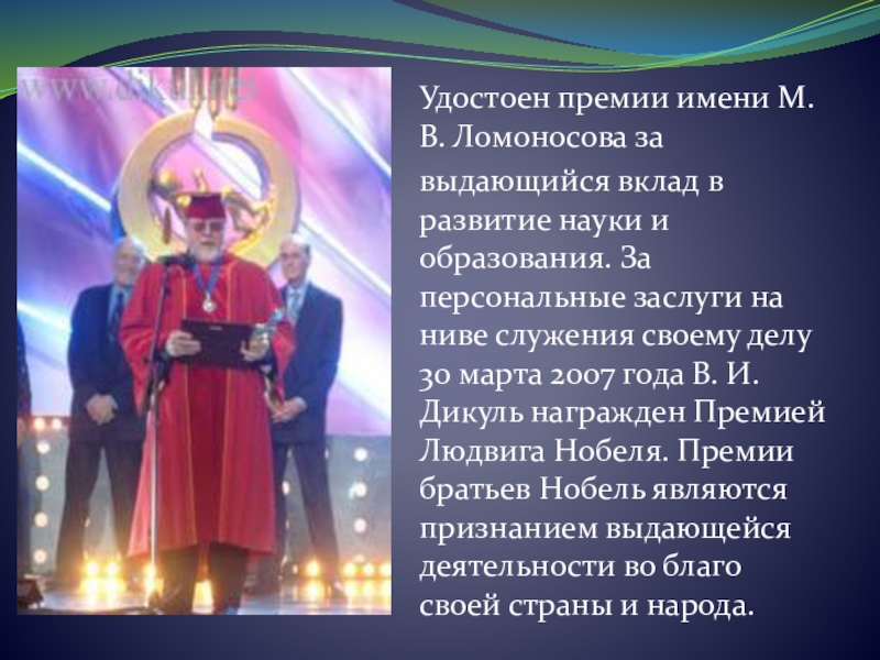 науки и образования. За персональные заслуги на ниве служения своему делу 30 марта 2007 года В. И. Дикуль награжден Премией Людвига Нобеля. Премии братьев Нобель являются признанием выдающейся деятельности во благо своей страны и народа.