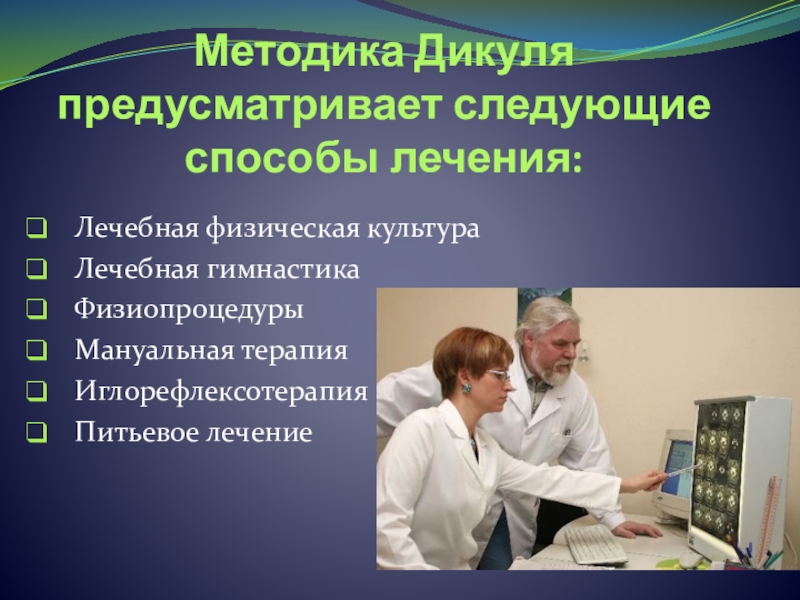 Слайд 15Методика Дикуля предусматривает следующие способы лечения: