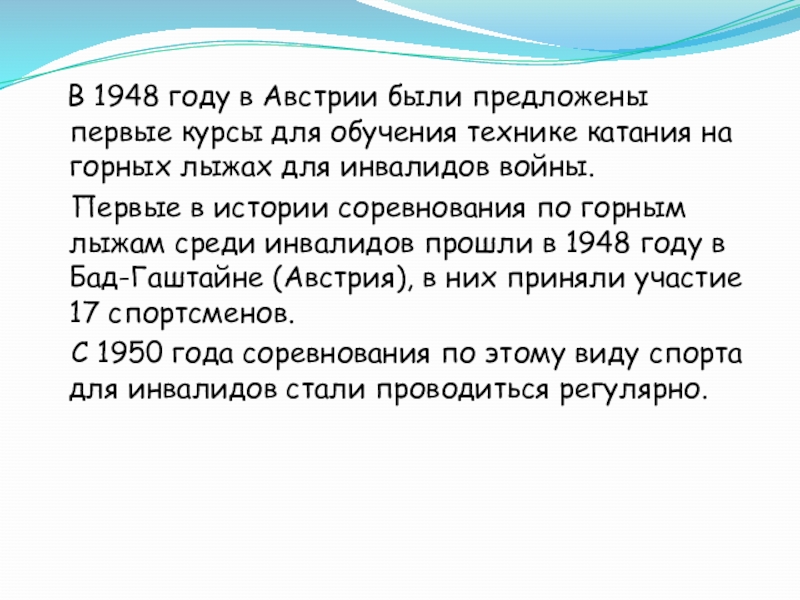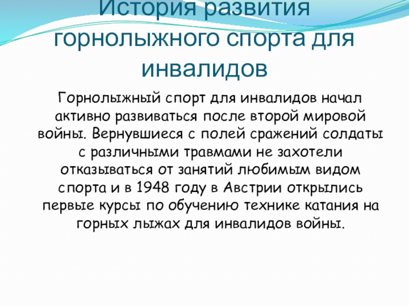 Слайд 2История развития горнолыжного спорта для инвалидов